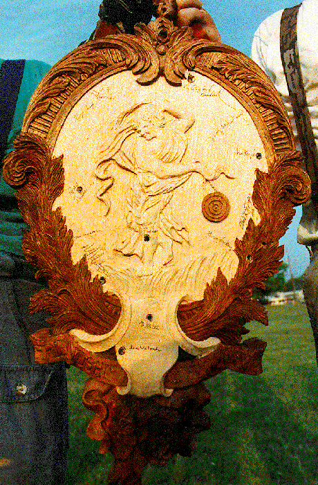 This unusual könig target was made by Mike Yazel, 1990 schuetzen king of the NMLRA. The wooden target is not painted, but is carved in bas relief. It was won by Gary Frecking in 1991.