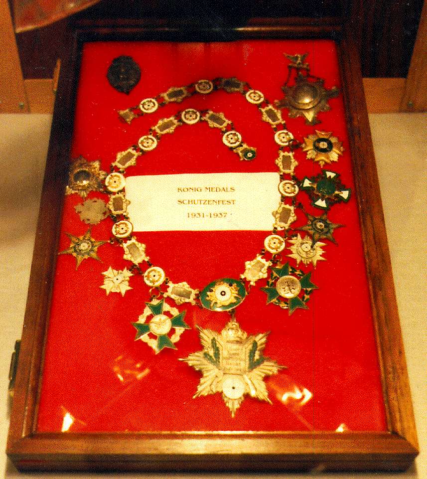 Ehren Ketten (honor chains) are beautiful traditional awards in Germany, home of many schuetzen competitions. This one was displayed at a special schuetzen exhibit in the NMLRA Museum. It represents shooting from 1931 to 1937. (From the Roy Keeler collection.)