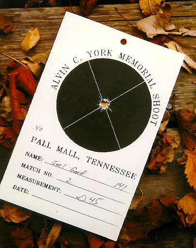 "So, how do I shoot a Chunk Gun match?" you might ask. You start by posting a practice target or a "spotter" target if you have prepared one in advance of the first relay. Shoot several shots into the practice target until you get a good consistent group that you think you can repeat on your record match. That practice target becomes your spotter for the next relay. For your record relay, with your spotter in hand, proceed to tack up your record target. Now put your spotter over the record target so that the "X" is sitting right in the middle of your practice target group. It doesn't matter where your group is on the practice target (high, low, left, right, etc.) just so that you put the record "X" in the middle of the group and then continue to hold the same sight picture when you shoot the next relay. Because your sights are fixed, you don't make sight adjustments for wind or light-you move the spotter instead.