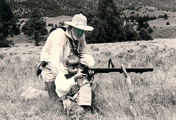 Dale Nelson coaches his grandson Danny while the boy shoots a 20-gauge Trade Gun from cross-sticks |