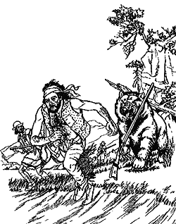 One of his earliest meetings with Old Ephram took place in 1830, when the twenty-year old Virginian had been in the mountains about a year. He and two companions by the names of Craig and Nelson had dismounted and were looking for beaver sign on foot. Suddenly, they came upon a bear at very close range - so close that they leaped for the nearest climbable trees. Meek and Craig picked a tall pine with many branches which made it as easy to ascend as a ladder. Nelson, on the other hand, chose one of two small trees growing close together to shinny up. The bear picked Nelson to go after. While grizzly bears are not tree climbers, they can be very ingenious. This bear put his back against one tree and his feet against the other and started to hunch and wiggle his way up toward poor Nelson, who was clinging to the skinny top of one of the two trees for dear life. As the bear climbed higher, the trees bent apart and the bear lost his purchase, falling to the ground with a thud. Undeterred, the bear remounted the tree and inched up toward the hapless mountain man. Once again, as he neared Nelson's precarious perch, the trees spread, dumping the bear. Now the bear was really angry. It made yet another assault on the tree, but with the same results. After the third fall, the frustrated bear ran off into the woods, leaving Nelson untouched physically but rather shaken mentally. At this turn of events, Craig began to sing and Meek to laugh.